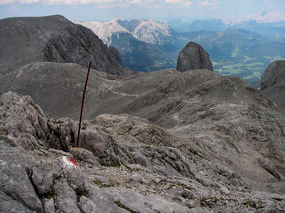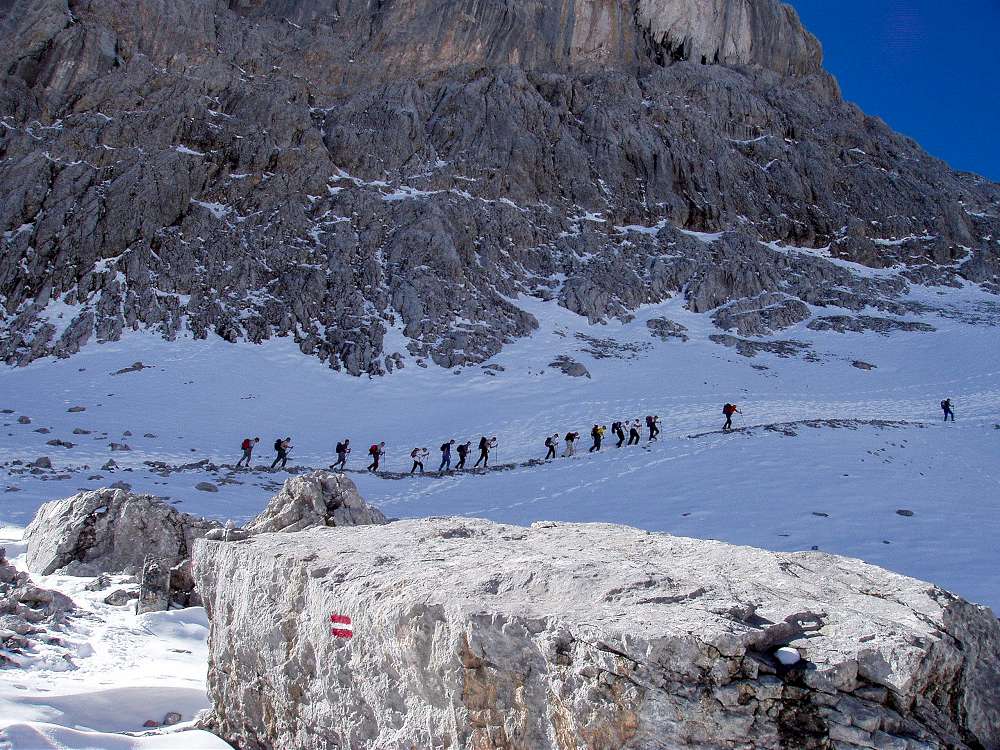 Die Übergossene Alm, der Plateau Gletscher der früher die Hochfläche bedeckte, ist quasi nicht mehr existent. Es gibt nur noch einzelne Eisflecken in den Mulden. Wenn man dem mit Stangen markierten Weg folgt, werden selbst diese Gletscherreste nicht mehr betreten. Steigeisen sind aus diesem Grund nicht mehr nötig.